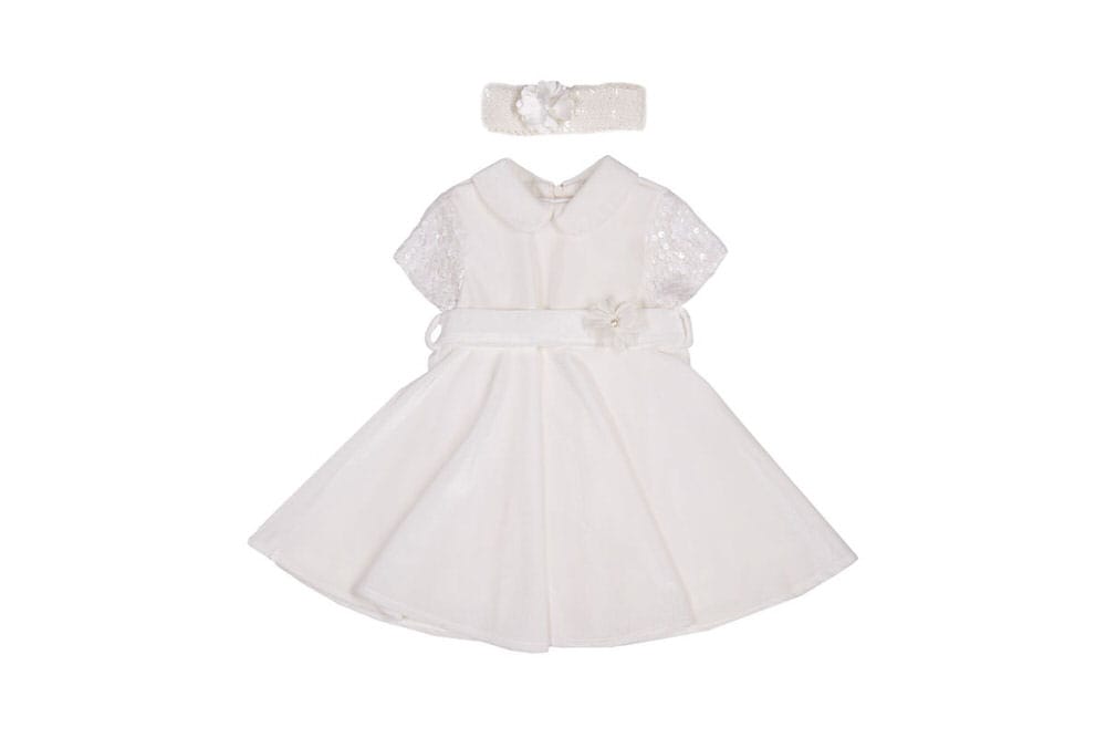 DettagliRaffinatissimo vestito battesimale in morbidissimo velluto, maniche corte rivestite a mano da paillettes, apertura dietro con lampo, cinta di velluto con fiore di raso panna fatto a mano, parte inferiore rivestita all’interno di uno strato di tulle e unp strato di battista, fascia per capelli in punto milano rivestita a mano con paillettes, lavare a 30°, lavabile a secco, stirare a max 150°, non candeggiare, non asciugare meccanicamente